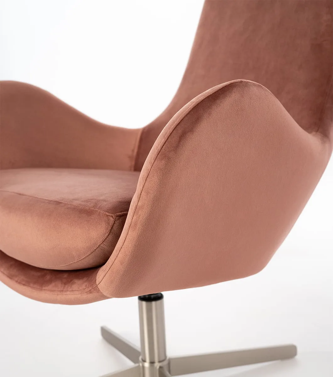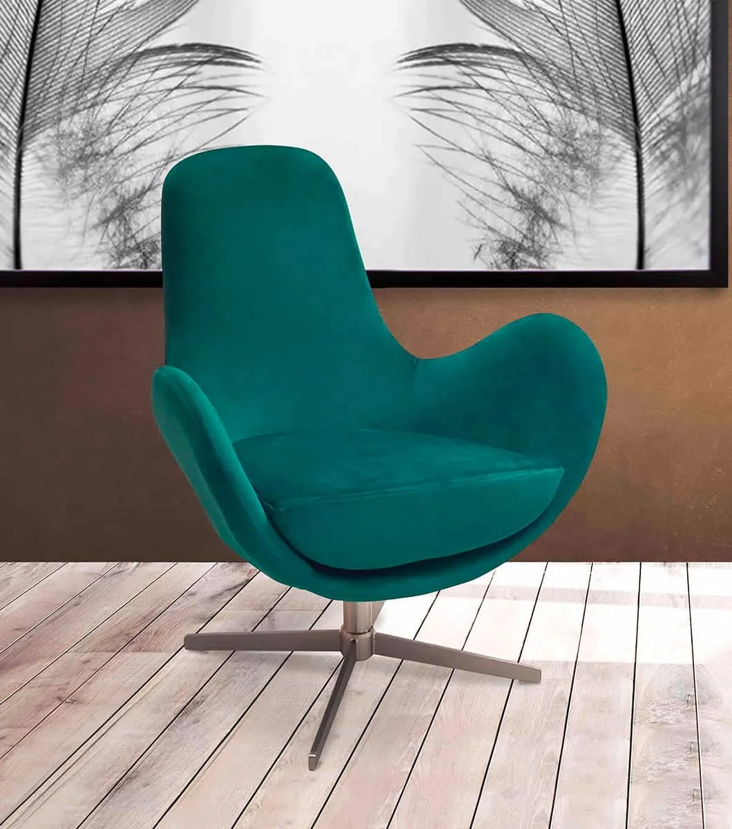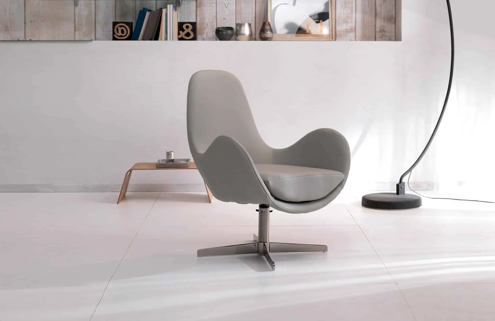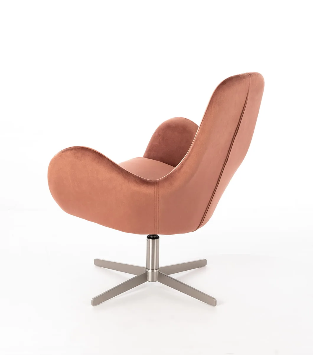 Olga, poltrona dalle forme morbide e sinuose si presta ad ambienti moderni e contemporanei. Disponibile in tessuto, ospita una base girevole cromata.