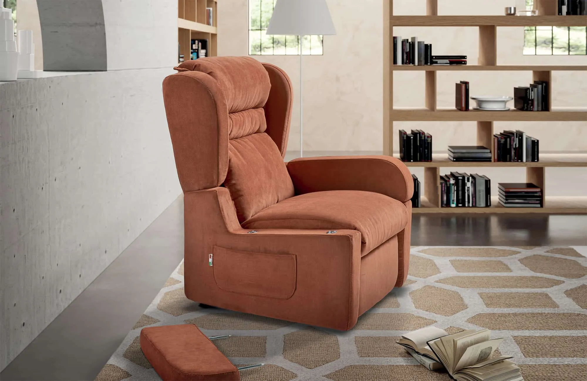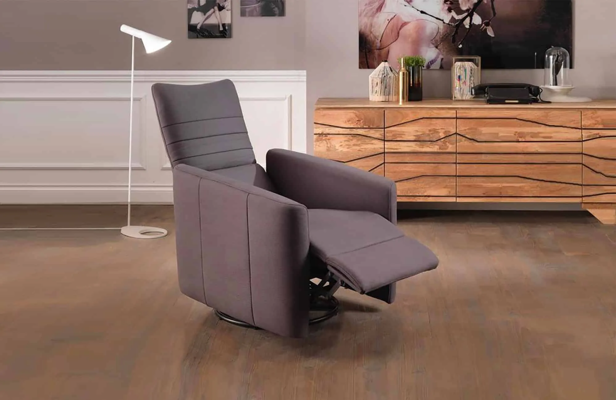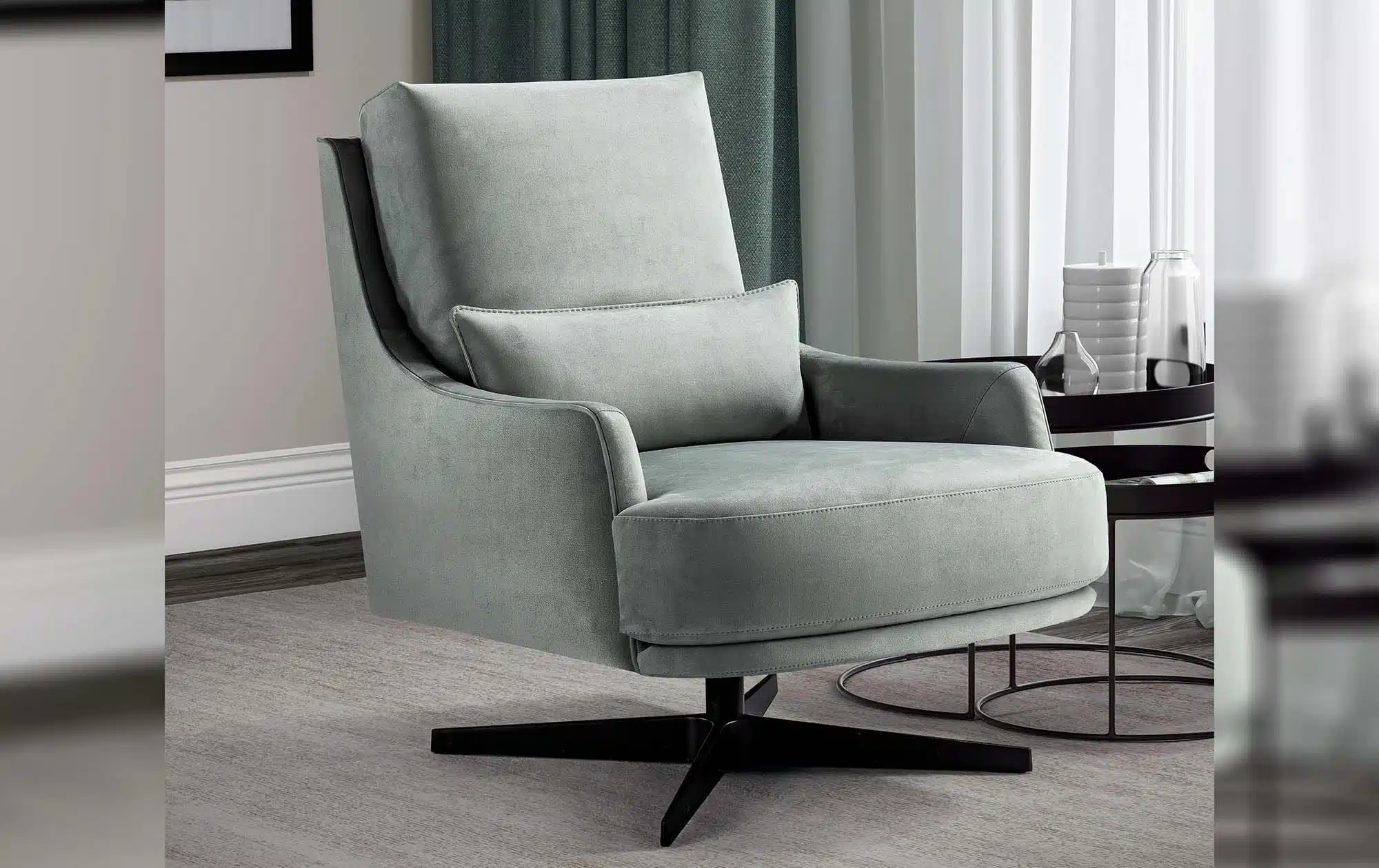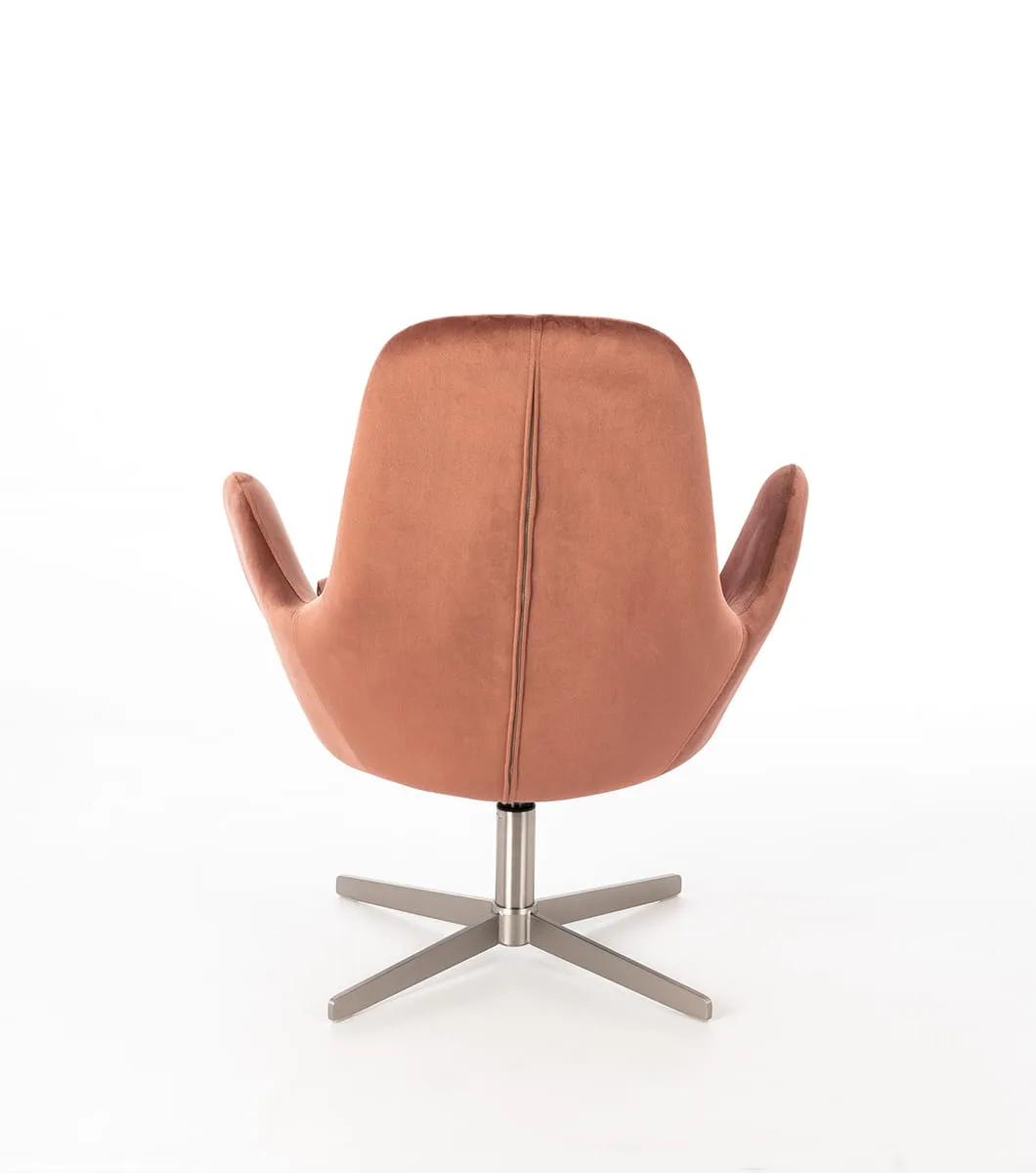 Olga, poltrona dalle forme morbide e sinuose si presta ad ambienti moderni e contemporanei. Disponibile in tessuto, ospita una base girevole cromata.